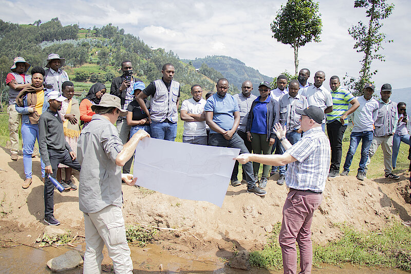 Prior to the workshop, a field visit took place in Mugogo lowland, , Nyiragaju area, Bikwi area, Mutera area and Karisimbi systems to assess the proposed initial design of flood control measures.